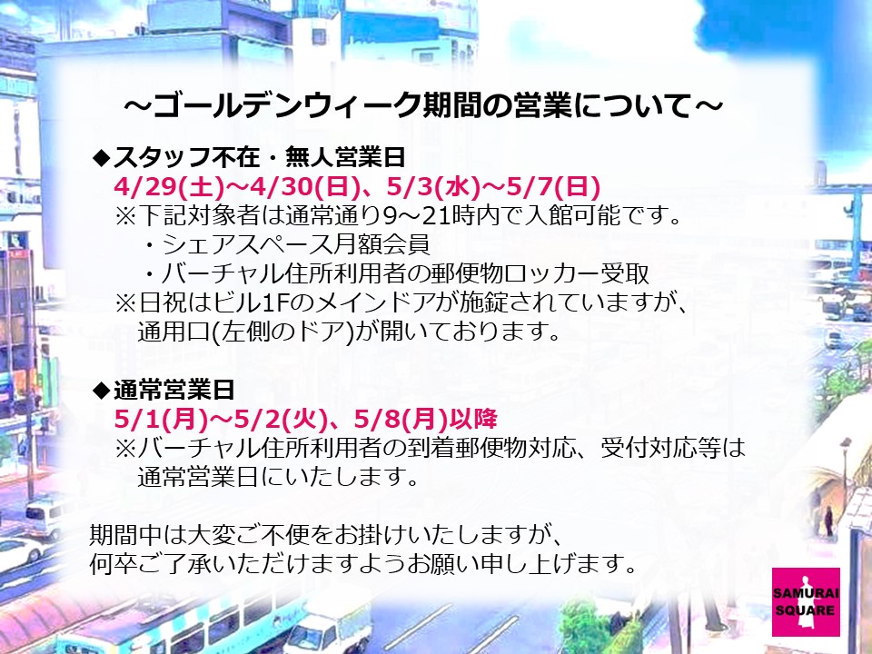 ※バーチャル住所利用者の到着郵便物対応、受付対応等は通常営業日にいたします。
