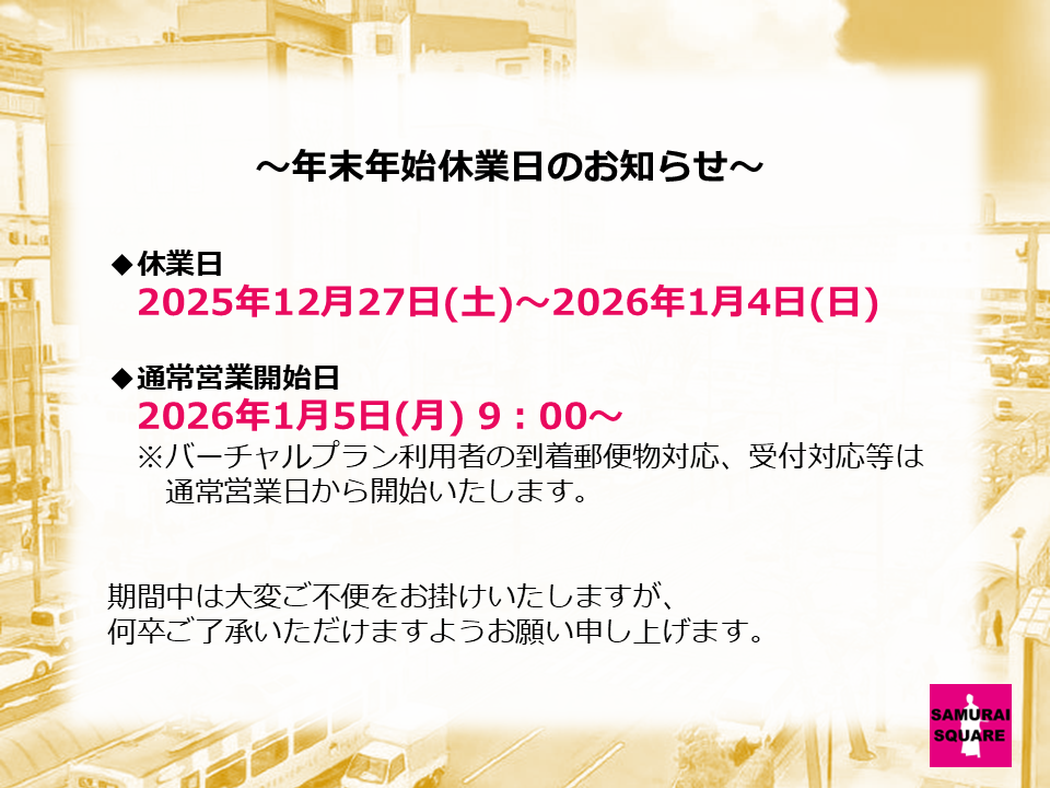 休業期間中に届いた到着郵便物確認は1/5(月)以降になります。ご了承ください。